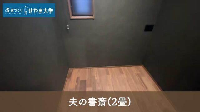 夫の書斎は2畳です。南側なので窓を付けています。また、打ち合わせをすることもあるので開き扉にしました。引き戸よりも開き扉の方が音対策として有効ですよ。また、家具がない状態だと部屋の中で音が響くので、家具を置いたりじゅうたんを敷いたり、他にも、壁に布を掛けてください。音が反射するようなものをたくさん置くことで、音の響きは緩和されますよ。